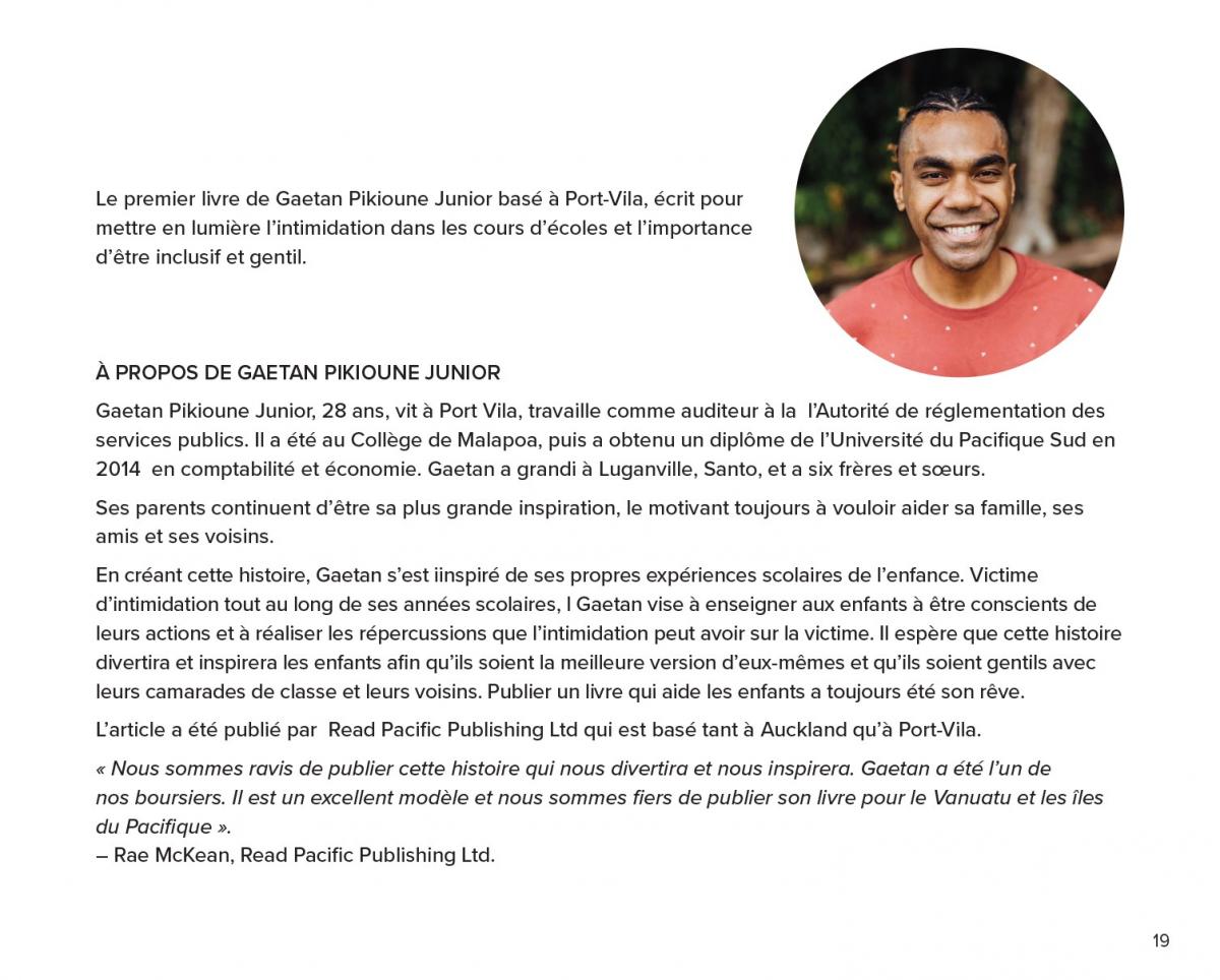 « Nous sommes ravis de publier cette histoire qui nous divertira et nous inspirera. Gaetan a été l’un de nos boursiers. Il est un excellent modèle et nous sommes fiers de publier son livre pour le Vanuatu et les îles du Pacifique ».