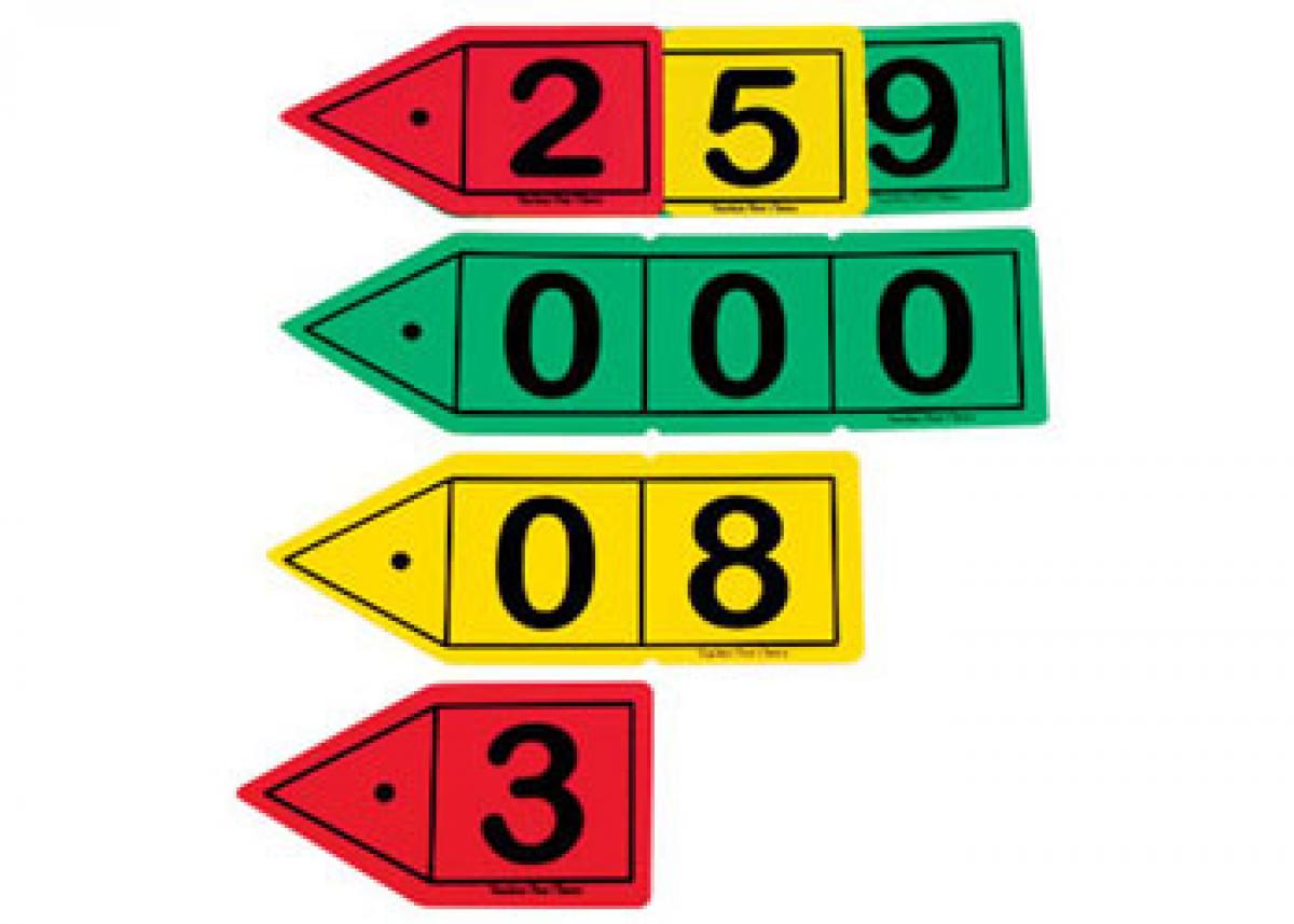 Decimal Place Value Arrows: From 0.0-0.999! Set of 30 durable, no tear plastic arrows, 10 each of 3 colours per set. Colour coded: green – thousandths, yellow – hundredths and red – tenths. The thousandths arrow measures 12.8 x 3.8cm.