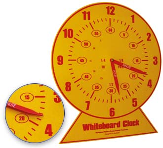 Designed for use on (whiteboards or metal surfaces. This is an excellent aid for teaching reading of an analog clock face. The connections between the hour and minute hands are clearly shown, as well as the concept of 20 to six, half past one etc.
