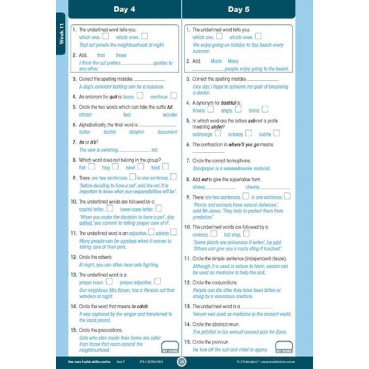 In this daily practice workbook for Year 6, there are questions to answer in the areas of phonological awareness, reading comprehension, spelling, word study, punctuation and grammar. The revised workbooks have 160 days of questions, broken into four groups of eight weeks. Skill focuses are included to help scaffold students with more challenging concepts that are covered throughout the books. A dedicated skill focus section provides students with daily practice of the focus skill, while the mixed questions will help students improve and consolidate their English skills as well as their knowledge about how language works.