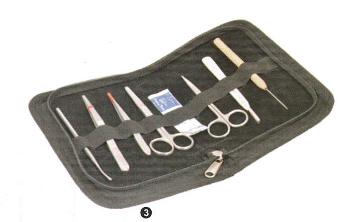 CONTENTS: 2 X Scissors; 2 X Forceps; 1 X Seeker; 1 X BP Handle with Blade; 1 X Needle (Wooden Handle); 1 X Zipper Case