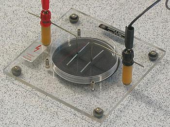 Transparent base with glass dish 90mm in diameter - 2 "T" shaped electrodes and 2 wire points can be immersed in the dish to demonstrate 2 different types of field.