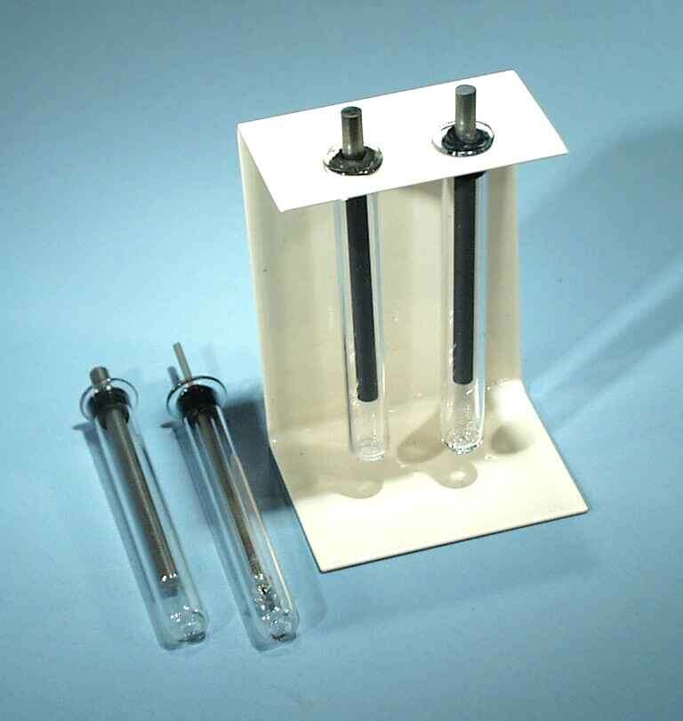 The "Norwood Electrode" set is used for simple electrolysis experiments. Includes 2 carbon, 1 stainless steel and 1 platinum electrode, each mounted in a glass holder. The set is complete with electrode support bracket to attach it to a small beaker. Comes with instructions.