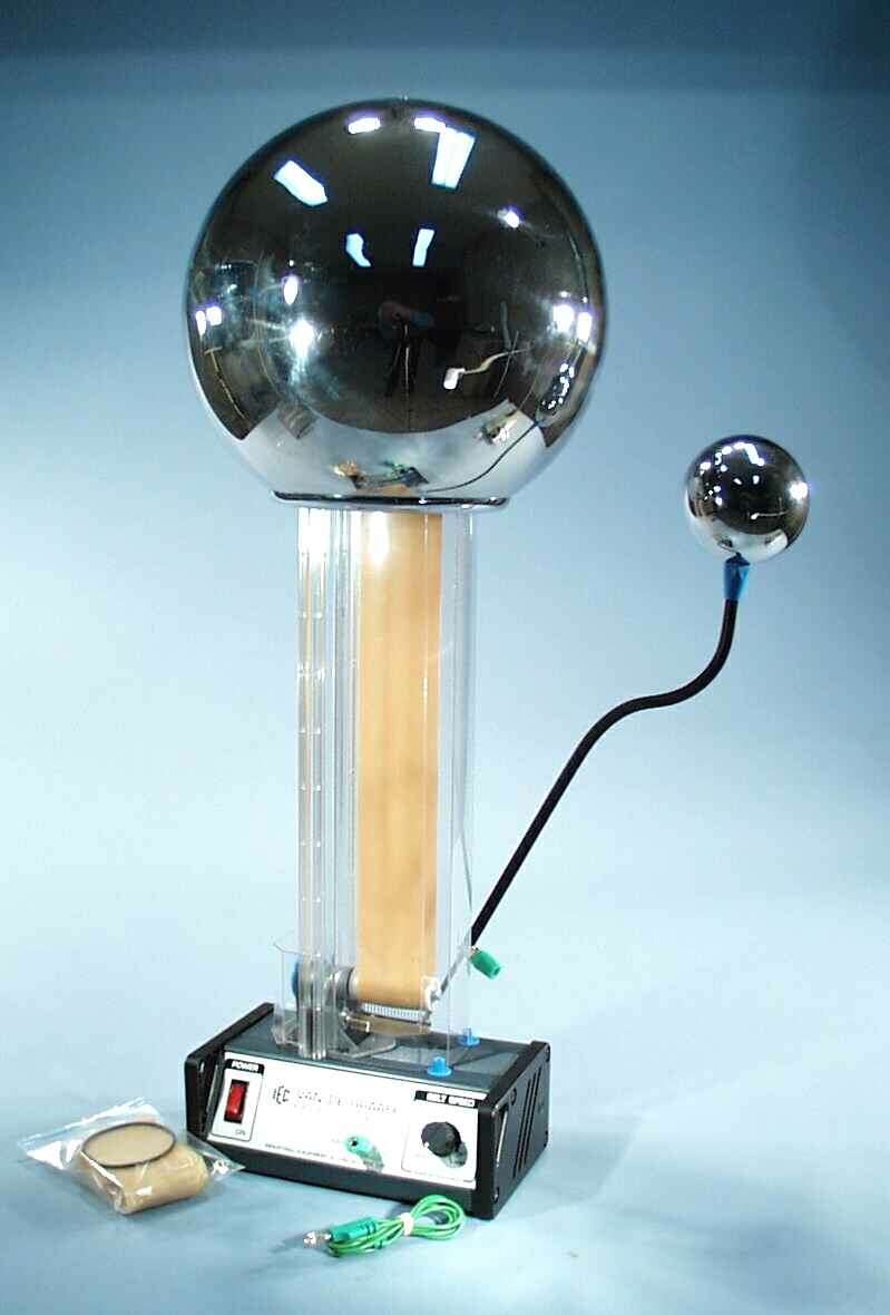 Large 400kV, variable speed. Upper pulley is mounted in ball races and the combs are easily adjustable for position. The power of the drive motor is adjusted by a small electronic speed controller so that slowing of the belt becomes evident as the the charge is transported into the upper sphere. A static charge is induced on the rubber belt when it contacts the motor pulley. The belt carries this charge progressively to the large upper sphere where it adds to the existing charge.