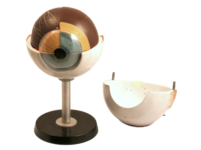 Removable parts include upper half of sclera with cornea and eye muscle attachments.